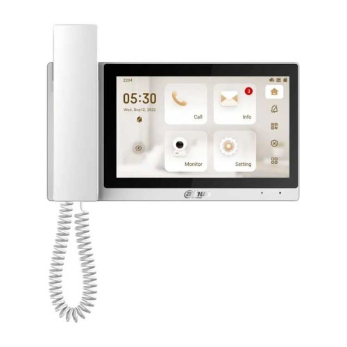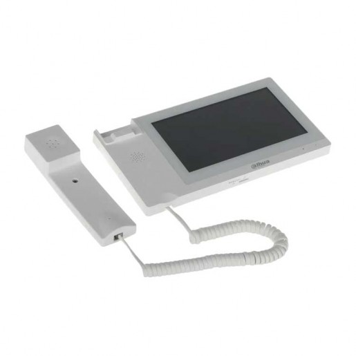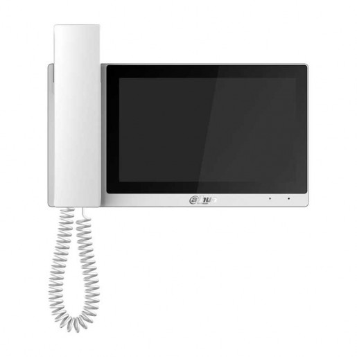 Монитор видеодомофона IP 7-и дюймовый с WiFi 2.4ГГц, с трубкой, черный/белый 1024x600 разрешение, ёмкостной сенсорный экран; тревожные входы / выходы 6/1; RS485; LAN; поддержка micro-SD до 32Гб; Возможность просмотра IP видеокамер; Питание: DC 12В/PoE(802.3af); Габаритные размеры: 236 мм × 129,8 мм × 23 мм; Установка - на стену/на стол.