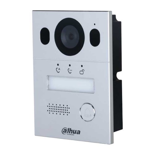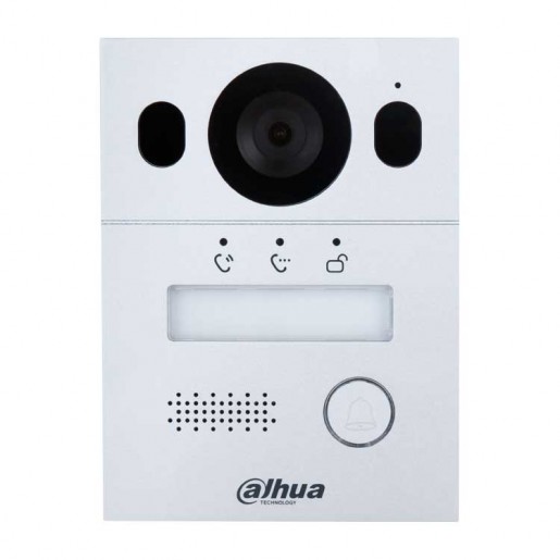 Вызывная панель с разрешением камеры 2мп и CMOS сенсором, угол обзора по горизонтали 110°, панель из алюминия, уровень защиты IP65, IK07. Поддержка режима "Ночь" и голосового оповещения. Групповые вызовы. Видео и аудио сообщения. Удаленный доступ через мобильное приложение DMSS. Питание: через 2-проводной контроллер; Выход питания: 12В, 200мА
