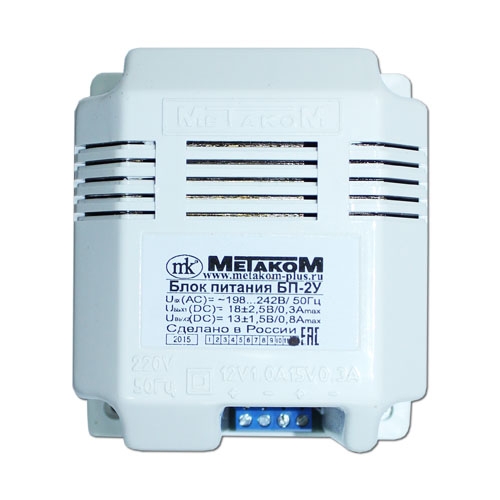 Блок питания МЕТАКОМ БП-2У предназначен для питания домофонных систем и дополнительного оборудования производства «Метаком». Мощность нагрузки не должна превышать 16,5 Вт. Выходное напряжение блока питания не стабилизированное. Питание блока осуществляется от сетипеременного тока напряжением 220 В частотой 50 Гц. Блок питания может эксплуатироваться в интервале температур от -30 до +40 °С при относительной влажности воздуха не более 95%. Блок питания имеет защиту от короткого замыкания по входу, и защиту от перегрузки по каждому из выходов.